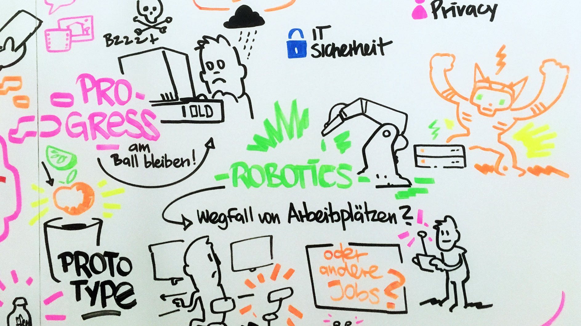 Illustration on-site – from graphic facilitation at workshops to themed sketchnote-walls during conferences: your topics and ideas leave a mark!